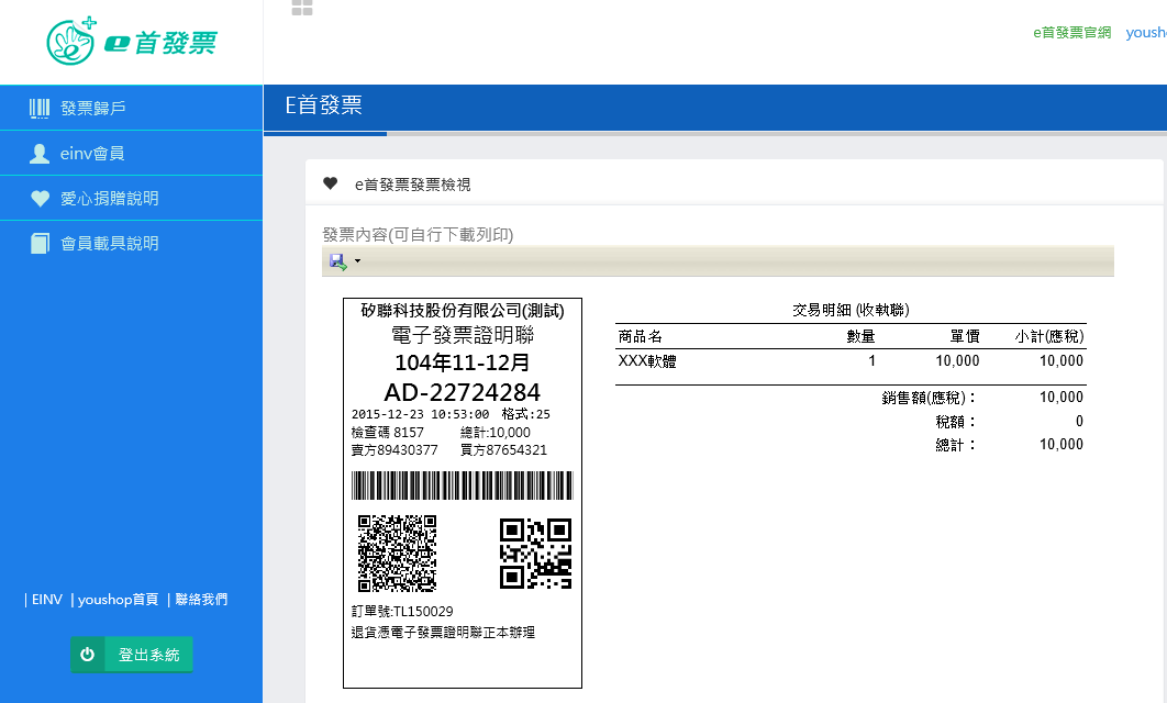 e首發票系統 將會判斷統編欄位將該發票採用 A0401 (B類)傳送到電子發票平台。開立後的電子發票為參照A0401格式,可自行於e首發票下載列印發票憑證。