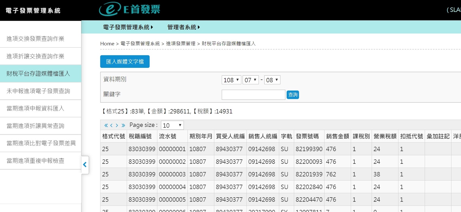 相關文章 e首發票進銷項媒體申報管理系統(選購) 文章目錄 導入電子發票後,發現電子發票與實體發票的申報檔案來源不同。造成許多客戶申報時不方便。進項電子發票都是副本,如果同一張發票重複請款我要如何辨別。財稅平台下載後的進項資料如果有些是開錯的,我該如何審核與知道是否申報過。這些都是電子發票導入後再申報時常常遇到的問題。我們推出 配合電子發票整合的媒體申報系統一、電子發票進項發票管理作業。二、進項電子發票申報查核作業。三、非電子發票匯入整合申報作業。四、進銷項媒體申報合併整合作業為你解決電子發票管理與媒體申報的問題。